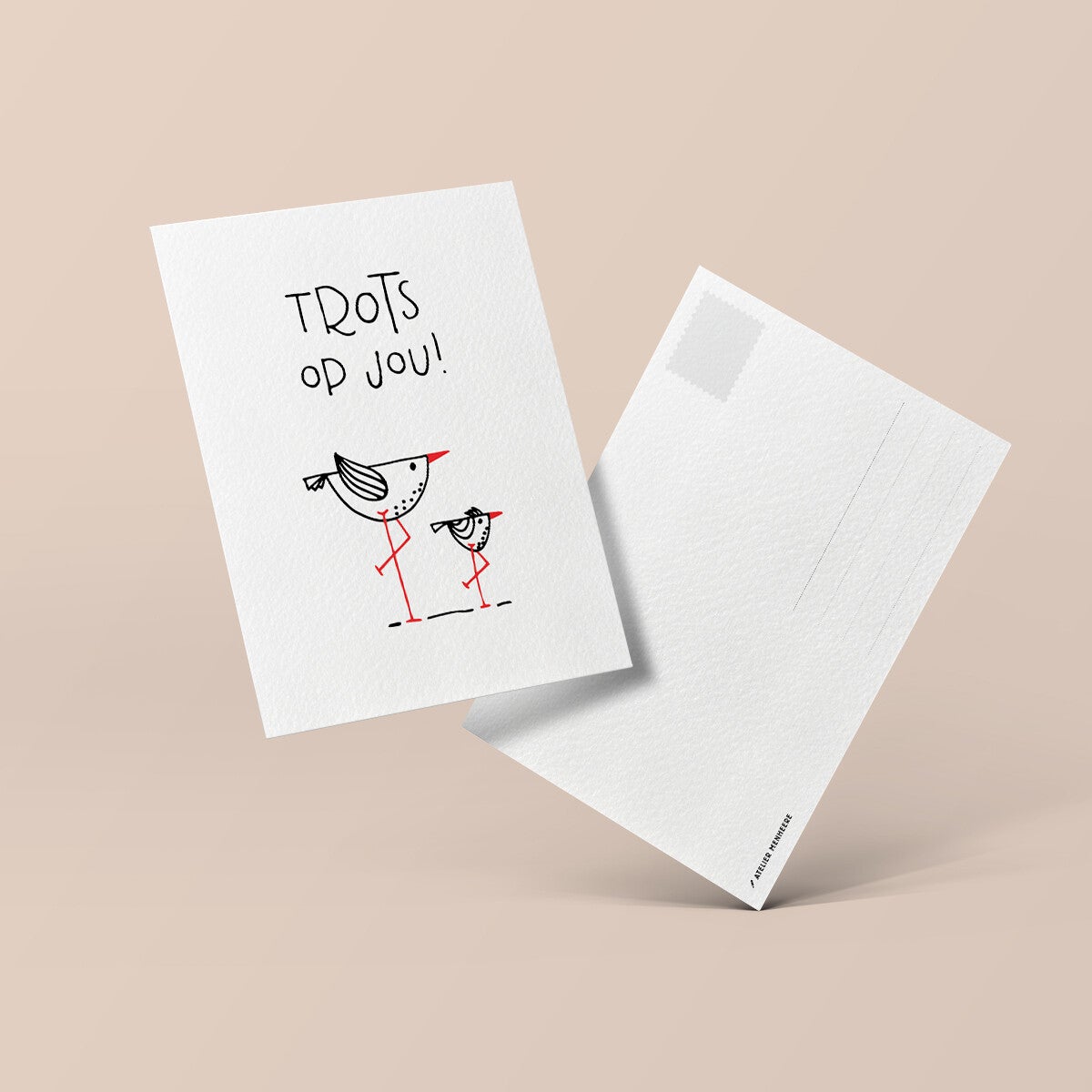 Ansichtkaart uit de Birds-serie met digitale afdruk van een handgetekende illustratie, gedrukt op 350 grams Tintoretto Gesso. Dit is prachtig ongestreken papiersoort met een subtiel structuurtje wat zorgt voor een unieke en luxe uitstraling. Het is een tikje gebroken wit en erg stevig. De achterzijde is voorzien van adresregels om op te schrijven.