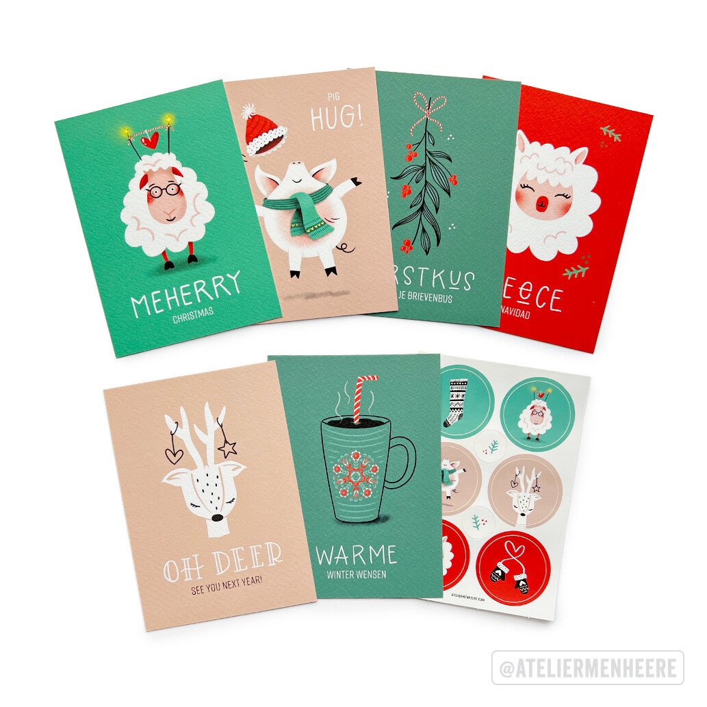 Set van 6 kerstkaarten met enveloppen en bijpassende stickers.