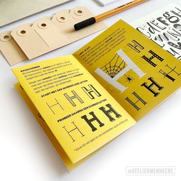 Maak je eigen kaarten met het handlettering pakket van Atelier Menheere. In dit thuisworkshop pakket vind je alle materialen om zelf originele kaarten te maken. Naast uitleg over het tekenen van prachtige letters met schaduwen en versieringen vind je in de handleiding ook alfabetten in verschillende stijlen en voorbeelden van leuke banners, kaders en kleine tekeningetjes om je quote mee te versieren.