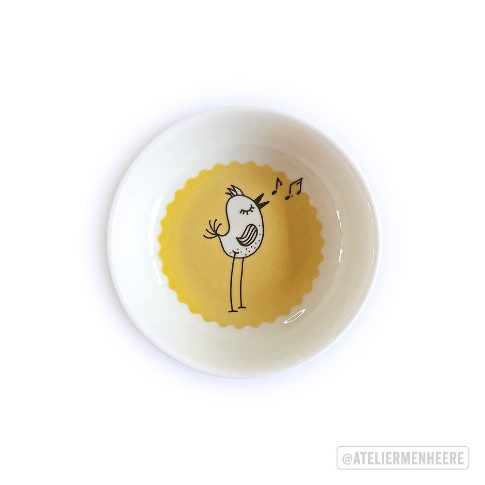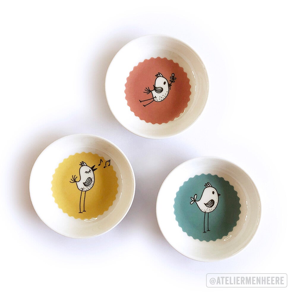 Leuk schaaltje met kleurrijke illustratie van eigen ontwerp uit de Birds-serie. Te gebruiken voor olijfjes, nootjes, dipjes en kleine dingetjes. Nieuw schaaltje, mag in de vaatwasser.